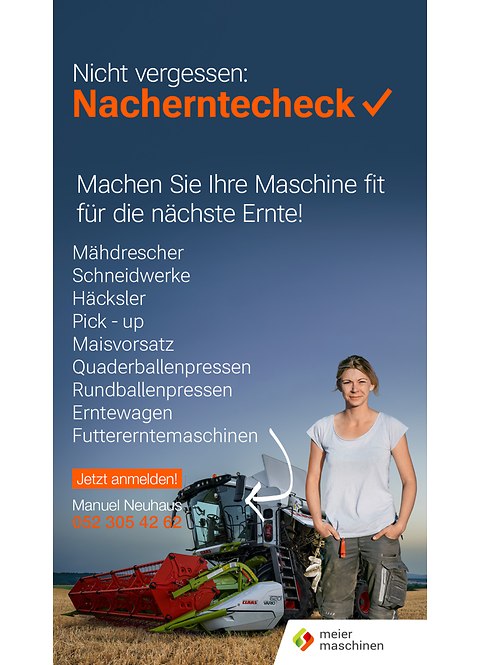 Mit dem CLAAS-Nacherntecheck und Service bei Meier Marthalen, stellen Sie sicher, dass Ihr Mähdrescher, Häcksler, Vorsatzgerät oder Ihre Presse zuverlässig und einsatzbereit vorbereitet ist für die kommende Saison nach dem Motto «Nach der Ernte ist vor der Ernte».